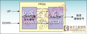 图2是PWM的基本方框图,而图3则是一个驱动模拟电机接口电路的调制输出。UP和DOWN输入信号被用来调整输出信号的占空比,它们可以由微控制器产生。第一个模块利用所有MAX II器件中都有的UFM振荡器来产生两个频率不同的时钟。来自该模块的4位输出信号DUTY_CYCLE的增加或降低取决于UP或DOWN信号的证实。第二个4位输出信号COUNT以第一个模块中产生的较高时钟频率连续增加。该信号与第二个模块中相同频率的DUTY_CYCLE信号进行比较。比较的结果是分配到最终输出信号PWM的单个位。信号DUTY_CYCLE是一个4位的变量,因此输出信号的占空比具有16个不同的取值。在本设计实现中,输入UP的优先级要高于DOWN。因此,如果两个信号同时为高电平,输出信号将被视作占空比的增加。