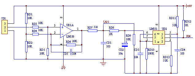 如图2所示,输入电压经射随器UD1A从LM331的7脚输入,电阻RD7 可以抵消6脚的偏流影响,从而减小频率误差,为了减少LM331的增益误差和由RD10、RD11、CD2引起的偏差,RD13选用51K电阻CD1为滤波电容。当6脚和7脚的RC时间常数相匹配时,输入电压的阶跃变化将引起输出频率的阶跃变化,如果CD3比CD1大的多那么输入电压的阶跃变化可引起输出频率的瞬间停止,6脚的电阻和电容可以差生滞后效应,以获得良好的线性度。