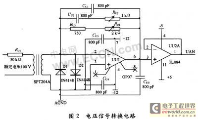 电流信号转换电路和电压信号转换电路类似,电压信号转换电路如图2所示。电压互感器的原边100 V,副边输出2 mA电流经OP07转换成-3.5~+3.5 V的电压量。D1和D2对运放OP07进行输入限幅保护,C2,R2,R3和R4为互感器相移补偿电路,C1,C4和C5用来去耦和滤波。运放TL084构成电压跟随器,起到阻抗匹配的作用,同时还有缓冲、隔离和提高带载能力的作用。低通滤波器的设计用MAX 274实现,TL084的输出接MAX 274的INA引脚。下面重点介绍由MAX 274设计低通滤波器的过程。