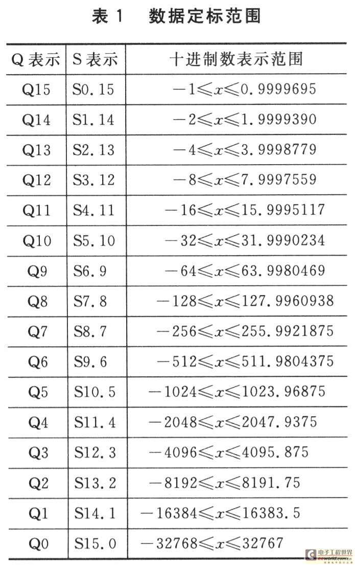 通过设定小数点在16位数中的不同位置,就可以表示不同大小和不同精度的小数了。数的定标有Q表示法和S表示法两种。表1列出了一个16位数的16种Q表示、S表示及它们所能表示的十进制数值范围。