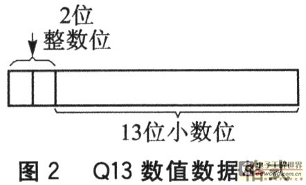 为了在以MSP43F1611为处理器的仪表系统上进行基于FFT的功率谱估计,必须先由MSP430F1611的ADC进行采样,而ADC采样得到的数据需要经过定标后才能进行定点计算。定标过程为:ADC的采样电压范围为0~2.5 V,因此,采样过程实际上就是将信号电压除以2.5进行归一化,使得采样得到的数据范围为O~1 V,此时数据就可用Q15表示,即将ADC的12位采样结果寄存器中的数据右移4位保存起来,维持12位精度,转换为Q15定点数表示。由于FFT运算过程中,蝶形输出相对蝶形输入数据被放大了3倍,因此蝶形输出数据范围为一3~+3 V。此时数据如果仍然使用Q15表示,就会发生溢出,故改用Q13表示数据,即将12位ADC数据右移1位。实际上经过处理后,ADC数据精度没有变化,但使用Q13表示数据比用Q12表示数据,其蝶形输出的数据精度高。这是由于定点计算时需要对蝶形输出右移以防止溢出,而使用Q13表示数据比使用Q12表示数据少右移了1位,因此多了1位有效数据。FFT运算过程中使用Q13表示数据,就使得加法乘法运算都可以直接使用定点指令实现,减少了很多判断处理,提高了运算速度。使用Q13表示数据,即最高位(左边的第1位)是符号位,剩下的15位表示数据的大小。表示数据大小的15位中,高2位(左边的第2位和第3位)用来表示数据中的整数部分,在计算中作为保护位;最低的13位(右边的13位)表示数据中的小数部分,如果经过某次蝶形单元运算后,最大值正好被放大3倍,此时数据就由13位扩大到15位,保证数据不会增大到16位,冲走符号位,发生溢出。运算完成后将FFT计算过程中的这一级所有结果都右移2位,就能够使得这一级计算结果的最大值仍然可用13位表示,同时也可将这一级所有蝶形运算输出的数据同时缩小,保证下级计算。表示数值大小的15位数据的数据格式如图2所示。