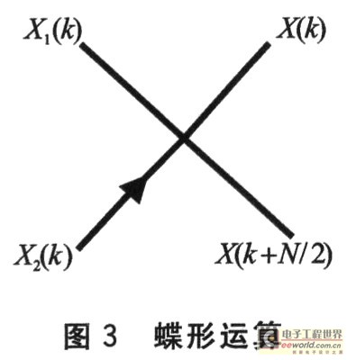 FFT中的蝶形运算如图3所示。设蝶形输入为:X1(k),实部为X1(k)r,虚部为X1(k)i;X2(k),实部为X2(k)r,虚部为X2(k)i。设蝶形输出为:X(k),实部为X(k),,虚部为X(k)i;X(k+N/2),实部为X(k+N/2)r,虚部为X(k+N/2)i。则有: