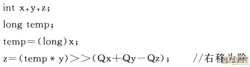 设浮点乘法运算的表达式为:float x,y,z;z=xy。假设经过统计(这里“统计”的意思是所有计算中数据范围都在定标范围内)后x的定标值为Qx,y的定标值为Qy,乘积z的定标值为Qz,则z=xy;zq×2-Qz=xq×yq×2-(Qx+Qy);zq=(xqyq)2Qz-(Qx+Qy)。所以,定点表示的乘法为: