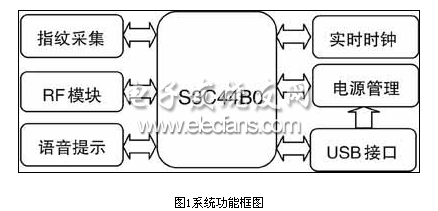 所设计的考勤机具有指纹采集和刷卡采集两大基本功能。指纹采集部分采用CMOS光学传感器。刷卡采集相应的射频模块,它可以通过串口的方式与CPU通信。考勤机和上位机的通讯则采用通用的模拟USB接口,有效地达到了即保证低成本又方便用户使用的目的。另外还加入了USB充电,实时时钟显示,语音提示等众多人性化功能。系统的框图如图1所示。