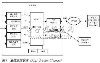 本系统需对被测设备如电力设备或太阳能的电压、电流或温度、光照度等进行测量、参数采集、存储,并实现远程监控。数据存储格式为 SNMP 的 MIB 数据库方式,数据库能够通过系统的NMP 代理被远方操作员的 SNMP 控制平台所访问存取。传输协议为以太网的 IP 协议。信息同时能够被本地操作显示,因此本地附有串行接口,基于以上应用需求,实现系统框图如下图 1 所示。
