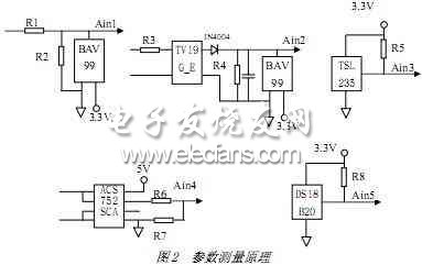 各参数测量是本系统的前端电路,也是最终目的。由于 ARM 系统 3.3V 供电,具有通用IO 接口和内置 ADC 电路,因此只要将各测量参数通过相应的传感设备转换为 IO 数据或0-3.3V 的模拟电压量,就可通过 ARM 处理器采集,从而转换为数字信号进而数字存储或通过网络传输。各参数的测量采集电路见图 2 所示。
