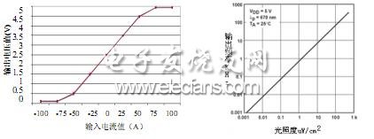 图 3a 电流感应输出电压关系图 图 3b 光照度频率关系图