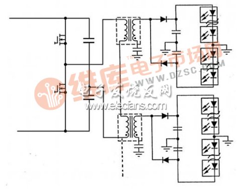 半桥谐振LLC转换器可以采用多变压器配置,如图4所示。图中所示的串联输入多并联LED驱动方案,有利于散热管理,无需反馈,成为LED照明模块的一种重要驱动方案。