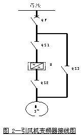 在锅炉二次风机上变频器调节装置改造成功后,使我们看到变频器技术改造的巨大节能潜能和良好的效益,2002年12月,我们在3#锅炉引风机上进行高压变频器调速系统改造,经过多方面技术考察、比较,我们认为北京利德华福技术有限公司生产的HARSVERT-A06/050变频器在性能价格比上有较好优势,并且产品在国内市场应用也比较广泛,售后服务全面周到, 图2—引风机变频器接线图 HARSVERT-A06/050变频调 速系统采用多级模块串联,交直交、高-高型电路,电源变换器采用30脉冲,二极管三相全桥,输出采用IGBT 逆变桥串连型式,原电动机电源直接作为变频器输入电源,再通过变频器输出连接到电机,为充分保证系统的可靠性,变频器同时加装了工频旁路装置,变频器异常时退出运行,电机可以直接手动切换到工频运行下运行。旁路由3个高压隔离开关QS1、QS2和QS3组成(见图2,其中QF为原高压开关柜内的断路器)。在变频运行时,QS1 和QS2闭合,QS3 断开;工频运行时,QS3闭合,QS1和QS2断开。