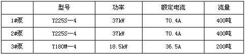 我公司热电厂日消耗水量约6000—7000吨,主要用于净化水处理、工业用水和生活用水,泵房共有补水泵三台,其电动机的技术参数分别为:
