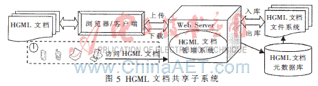 HGML文档共享子系统中用户通过IE浏览器或客户端向远端Web Server服务器端上传/下载HGML文档,并保存在HGML文档文件系统中,HGML文档的元数据(HGML文档属性数据)保存在HGML文档元数据库中,方便HGML文档管理系统进行管理,HGML文档管理系统提供HGML文档的增删改查等功能。