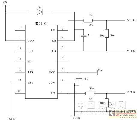 驱动芯片IR2110用于驱动半桥电路如图4所示。
