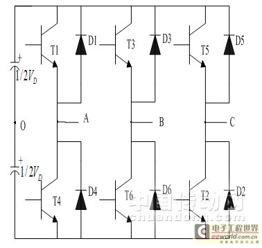 目前比较经济可靠的方案,一般都是采用二极管整流,使电网功率因数与逆变输出电压无关而接近于1。在本系统中,我们采用了三相二极管不可控整流,如图2所示,采用它无需控制电路驱动,电路简单、可靠,成本低,缺点就是纹波较大,需采用较大幅值的滤波电容。