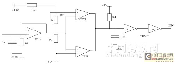 其中运放C814组成电压跟随器,其输入来自电流互感器的输出。两个电压比较器C271组成窗口电压比较器,比较器的输出经施密特反相器连接到与门的输入端。当IGBT没有过电流时,C814的输入电压比较低,窗口电压比较器输出高电平,因此EN信号为高电平,使IGBT驱动信号有效;反之,当IGBT过电流时,EN信号变为低电平,封锁了IGBT驱动信号而使IGBT关断,调节电位器RP,可以改变过流阀值的大小。
