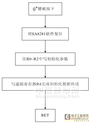 对SA8281芯片的控制是通过微处理器接口将相应的参数送入芯片内部两24位的寄存器R4、R3来实现的,它们是初始化寄存器和控制寄存器。数据先被读入一系列临时寄存器R0~R2中,然后通过一条虚拟的写操作将数据传送至相应的R4,R3寄存器。