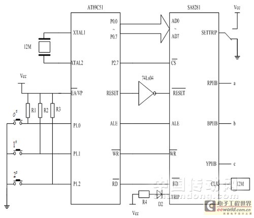 AT89C51是地址与数据总线复用类的单片机,为了隔离潜在的噪音干扰,设置输出断开引脚SETTRIP在通常情况下接地,同时设置了开关,便于在紧急情况下迅速关断所有PWM输出;为使PWM输出处于有效状态,输出关断引脚 接高电平[ 6]。外部时钟CLK引脚接独立的12M有源晶振为SA8281芯片提供一时钟基准用于控制与PWM有关的各时序。