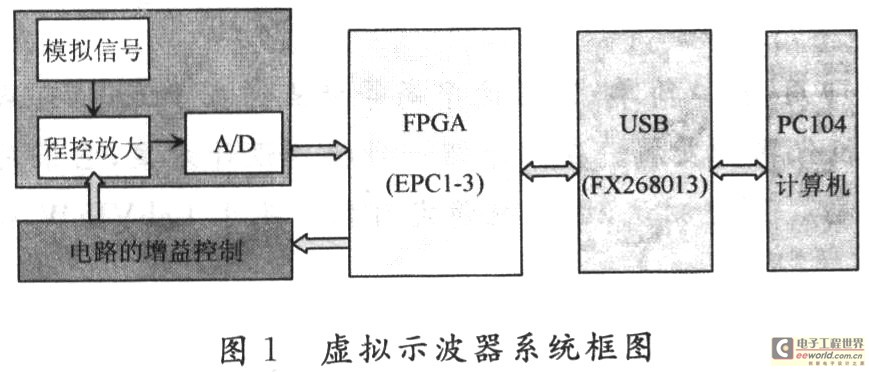该系统是虚拟示波器,主要工作是采集被测模拟信号,并将信号通过USB2.o接口传输到PC104计算机,运行计算机LabVIEW平台下的应用软件完成数据的处理与记录,并在显示器上绘制曲线。