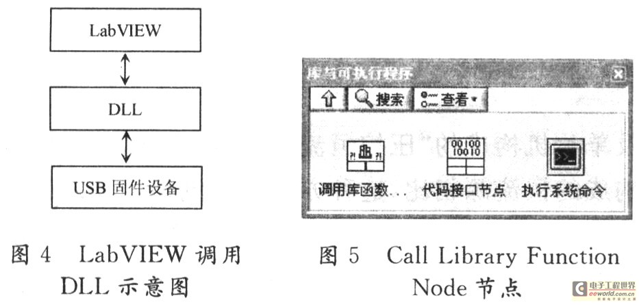 因此,开发上层应用软件的首要工作是DLL动态链接库的开发,在这里DLL动态链接库采用VC++6.0进行开发。LabVIEW调用DLL示意图如图4所示,由于DLL能够调用API函数与USB设备进行通信,而采用NI公司的虚拟仪器软件开发平台LabVIEW可以充分发挥虚拟仪器的灵活性。因此,将两者优势结合起来,该设计的虚拟示波器用户控制面板具有界面友好,操作直观等优点,通过面板上的各种控件便可实现数据的采集、存储、再现及分析等功能。