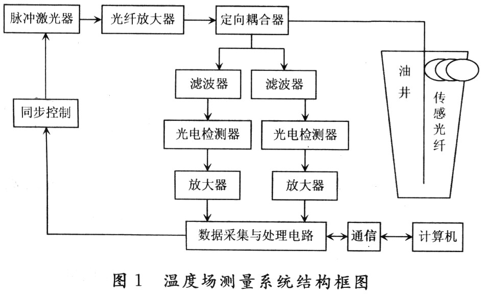 温度场测量系统的工作过程如下:在计算机和数据采集电路的控制下,脉冲激光器发出光脉冲信号,光脉冲信号通过光纤放大器放大后经定向耦合器耦合到传感光纤中,传感光纤则置身于重质油温度场中。在传感光纤中传播的光脉冲,其传播过程中各点位置上引发的散射光(拉曼散射光中的斯托克斯和反斯托克斯)中的后向散射部分再次经过光纤传输通道进入定向耦合器耦合到接收通道。通过光学滤波后,滤掉能量相对较强的瑞利后向散射光,分离出载有温度信息的反斯托克斯光和斯托克斯光,分别送光电检测器进行光电信号的转换。再经过放大后,送到数据采集与处理电路进行A/D转换及信号的相关处理,并将处理后的信息送入计算机进行分析处理和显示。