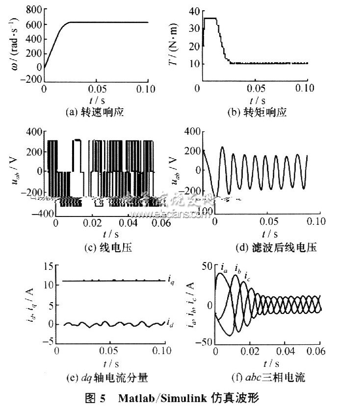 本文利用Matlab/Simulink工具箱,根据图1搭建系统模型,对一台3对极永磁同步电机进行了矢量控制策略的仿真,所得仿真波形如图5所示。
