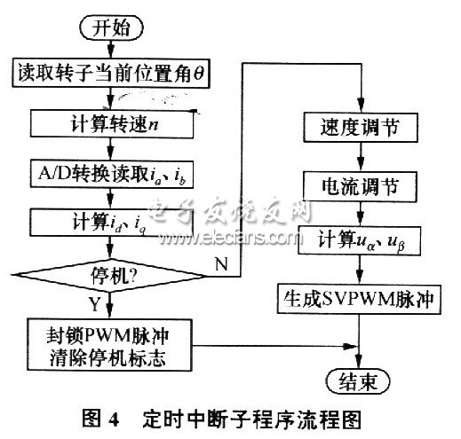 永磁电机推进系统的软件主要由3部分组成:初始化程序、主程序和中断服务子程序系统复位时,先执行初始化程序,检测、设定DSP内部各模块的工作模式和初始状态主程序负责收集电机电流、转速等一系列实时运行信息;定时中断子程序则是实现电机矢量控制策略的核心程序,主要完成PI调节和SVPWM波形发生这两大功能,其流程图如图4所示。