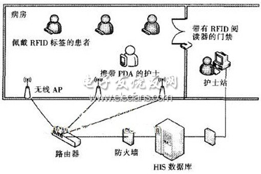 医院数字化基于RFID的无线护理信息系统工作环境如图1所示病区内部署无线局域网,根据PDA工作范围部署无线AP(AccessPoint)。患者佩戴RFID标签带,护士携带带有RFID阅读功能的PDA通过无线网络与HlS进行信息交换。