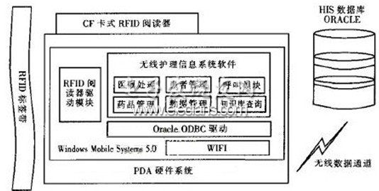 系统运行环境为WindowsMobileSvstem5.0,PDA上安装CF卡式RFID阅读器,通过驱动程序将标签上的数据传送给护理信息系统,实现患者和药品的唯一性确认。护理信息系统通过0racle0DBC驱动程序连接HlS数据库,实现数据交互,链路层上通过无线网络实现。