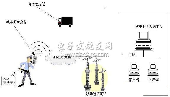 通过给执法人员配备便携式稽查设备,可用于对慢行或驻停车辆进行稽查。当执法人员将手持稽查系统的接收天线对准可疑车辆时,如果系统显示的信息与该车辆的物理特征相符,则为合法车辆,如果系统接收不到电子信息或接收到的电子信息与物理特征不符,则可判断出该车为非法车辆或问题车辆,系统将立即发出报警提示;同时手持稽查系统也可设置成与就近的固定稽查系统无线连接,当固定稽查系统发现问题车辆时将即时向手持稽查系统报警并显示该车信息;