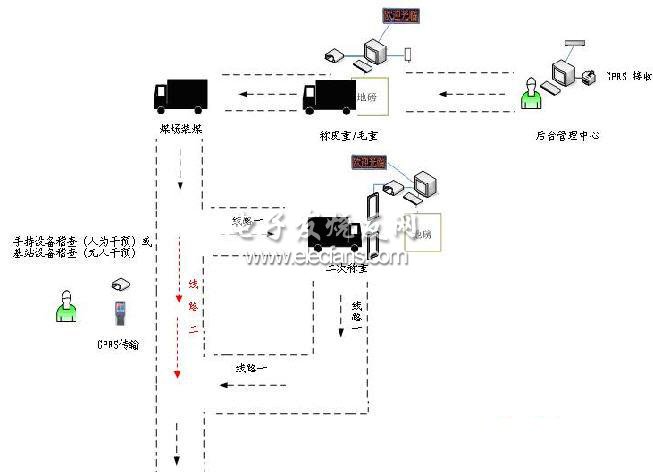 (3)运输车辆入场装煤及二次称重:合法煤炭运输车辆进入煤场装煤,完成装煤后,车辆进入二次称重场称重,读写器同时记录车辆进场时间、离场时间、运煤车总重量及运煤重量;在运输车辆装煤结束后,有些合法车辆并未按照相关规定进入二次称重场,而直接沿大道驶去,给企业和国家造成极大经济损失,在充分考虑各种因素后,设计了在运输道路的分岔路口安装固定式读写器或者手持式读写器进行稽查,在系统中形成车辆行驶轨迹,方便查阅(固定设备或者手持设备稽查到经过此处的相关合法车辆后,通过GPRS或者其他方式传到后台),以防止合法运煤车偷盗国家或企业的煤炭资源。