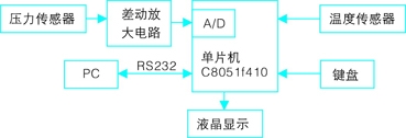 此压力传感器采集系统由硬件和软件两部分组成,如图1所示系统硬件主要包括压力传感器及其放大部分、温度传感器、单片机电路、显示部分和键盘输入。软件部分包括以下模块:对单片机及a/d转换器的初始化、a/d转换器的校准(包括各通道增益)、零点漂移校正、现场压力和温度数据的采集、压力传感器的零点校准、温度漂移补偿和非线性补偿、串口通讯。单片机对接收到的信号进行必要的处理后发送到显示设备显示给用户,也可以根据需要把数据存储到存储器件中。用户通过键盘对系统进行控制。