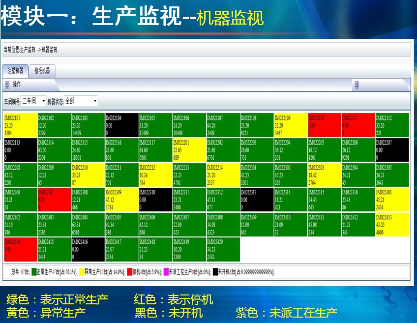 (13) 报表管理,包括注塑周期明细报表、OEE报表、短消息汇总报表、QC巡检签到报表、停机原因统计报表、车间用料统计报表、模具模次统计报表、成型参数报表、派工单达成率报表、生产日报。