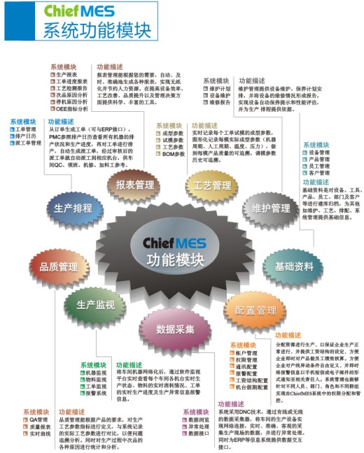 ChiefMES——注塑车间管理系统”可以实时查看到整个注塑车间的生产机器运行状况、数据采集、维护管理、工艺管理、生产监视、生产排程、报表管理、品质管理、订单生产进度等信息,使用户能快速地得到生产车间的统计分析报表等信息,从公司整体运作来看,它连接于上层ERP系统、SCM系统和下位的生产设备DCS系统之间,为企业提供实时、准确的生产数据来源。从现场管理来看,它整合了工厂现场各单位(如:物料、生管、制造、品管、仓管等)的各项生产数据,使各单位迅速得到所需要的相关资讯,继而进行分析。达到车间生产管理的透明化诉求,并与ERP/MRPII等企业信息系统进行数据交互,提升了生产管理职能部门的信息共享、协同效率和过程优化