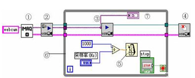 在LabVIEW 中,由于将调用函数模块化了,因此调用USB摄像头非常简单。图3是LabVIEW调用USB摄像头采集图像的编程。调用的过程如下:调用摄像头①IMAQ Create.vi —> ②IMAQ USB Grab Setup.vi —> ③IMAQ USB Grab Acquire.vi —>④IMAQ USB Close.vi,该过程为静态拍摄一帧。加上一个循环⑥While Loop,通过⑤Wait Until Next ms Multiple控制While Loop每隔多少毫秒触发一次(默认值为33.3毫秒,也就是每秒三十30帧),输出⑦Image Display。
