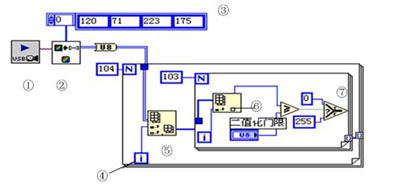 从USB摄像头采集到的图像经过图4进行二值化的编程处理:从①IMAQ USB Grab Acquire.vi输出的图像②IMAQ ColorImageToArray,由③Optional Rectangle功能截取采集图像的有效部分并转化为一个32位的二维数组。为了便于确定二值化门限的标度,使用To Unsigned Byte Integer 把32位数组转化为8位数组,通过两次使用④For Loop的循环端口i和⑤⑥Index Array对二维数组进行索引;使用Less Or Equal?和⑦Select对数组的每一个值与预先的门限值进行比较判断,规定大于预先给定门限值为0(亮度最小),否则为255(亮度最大)。经过二值化处理后的数组通过IMAQ ArrayToImage转化为图像显示出来,这样就把采集到的图像变为只有黑白两种颜色。其中,白色代表物体所成的像,黑色为背景图像。