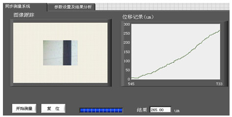 USB 摄像头将被测物体所成像变为数字图像输入计算机,由LabVIEW软件平台调用并显示。考虑到显示的方便,测量程序设为两个界面显示。图2是测量程序的实时同步测量界面。“图像跟踪”实时显示摄像头拍摄到的显微镜成的细丝图像,直观显示图像移动,图中黑色物体为细丝的图像;“结果”和“位移记录”实时显示物体位移变化;点击“开始测量”键,计算机启动摄像头开始测量;点击“复位”键重新测量。考虑到摄像头开始工作时一般都不稳定,设置计算机启动摄像头开始测量后采集到的前15帧图像不予采用。为了方便显示,设置图像采集在蓝色进度条走完之后开始测量。通过这个界面,能够直观观测到物体的图像和位移。