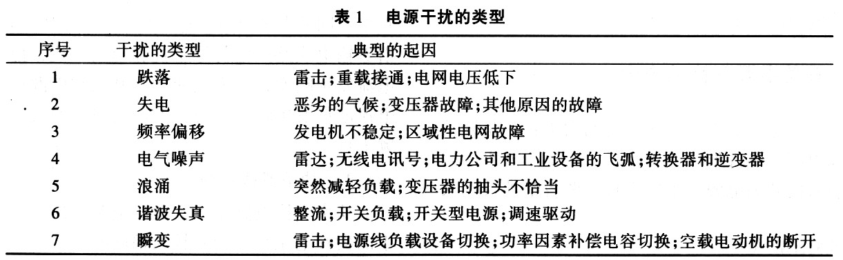 在表1中的几种干扰中,能够通过电源进行传输并造成设备的破坏或影响其工作的主要是电快速瞬变脉冲群和浪涌冲击波,而静电放电等干扰只要电源设备本身不产生停振、输出电压跌落等现象,就不会造成因电源引起的对用电设备的影响。