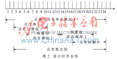 本设计通过乒乓结构实现了块与块之间的流水。图2是本设计的总体时序安排,图中考虑到变换编码后一个块内的有效系数一般小于25。其中以一个块数据输入反量化模块作为起始时刻,当反变化模块读取一个寄存器组并将其作为转置寄存器使用时,另一个寄存器组用于存储下一个块的反量化结果。如图2,寄存器组1用来存储当前块反量化后的变换系数值,而寄存器2被用于上一个块的反变换中。另外,读取转置后的数据时,通过对移位最初的寄存器赋零对寄存器2清零,从而用于下一个块的变换系数的存储。