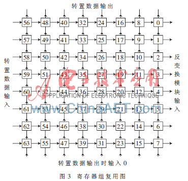 在反变换中也需要用到转置存储。为了节省资源,本设计采用了寄存器复用技术,即反变换中用到的转置矩阵与逆扫描后用于存储变换系数的矩阵复用,具体复用方法如图3所示。