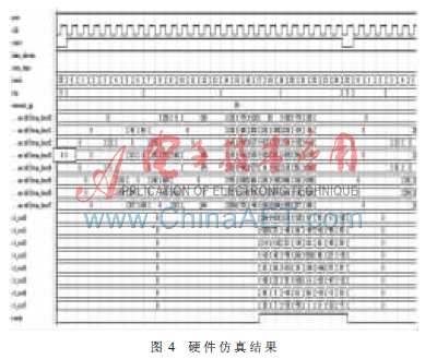 反变换模块的时序见图2,第1时钟周期进行并行读取数据,2个时钟周期进行一维反变换,第4个时钟周期开始向转置矩阵中存入一维反变换后的数据,第12周期开始读取转置矩阵中的数据,第15个时钟周期开始输出数据,第22个时钟周期结果输出完毕。