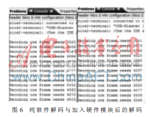 本设计采用的是自顶向下和自下而上的混合设计方法,逆扫描、反量化和反变换过程是AVS系统中的一个模块,局部的测试很难判断出该模块是否可以应用到整个解码系统中去,所以此模块亦在自己搭建的基于SoPC的AVS验证平台上进行了验证。加入此模块前,软件处理一帧码流时间与用此硬件模块代替软件模块后的解码时间如图6所示,通过计算可知解码速度提高约15%。