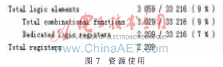 变换编码后一个块内的有效系数一般小于25,所以逆扫描、反量化的时钟一般小于25个时钟周期,而反变换的时钟周期为22个,所以处理一个块的时钟周期大约为25个,大大提高了速度。由于寄存器的复用及设计的优化,节省了硬件资源,本设计采用的FPGA为EP2C35F672C6,资源使用情况如图7所示,可见使用的总的LE为3 059个。