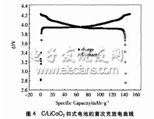 图4是经过了极片制备工艺、装配工艺和封口工艺优化后的CLIB充放电曲线。由图可知,经过配膏、搅拌、干燥温度、干燥时间、压片、装配、封口等工艺优化后,C/LiCoO2扣式电池已经由原来只能充电、不能放电变成了可充可放的充电电池。