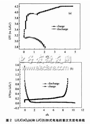 实验结果表明,用实验①和实验②做成的电池几乎都不能放电,但用实验③做的Li/LiCoO2、Li/C电池均能放电,图2为其首次充放电曲线。说明按2.2节工艺规范所制备的正负极片可以充放电;而公司原本可充放电的极片在电池的装配和封口之后却不能进行充放电,故可得结论:电池不掉粉并不等于电池可以充放电;2.2节工艺规范是合理、正确的;电池的充放电性能与电池装配和封口工艺有很大关系。