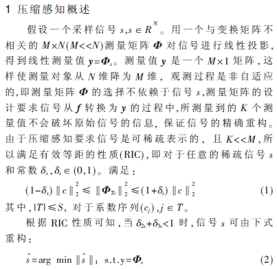为了解决这个问题,由Candes和Donoho等人提出了压缩感知理论CS(Compressive Sensing)[1-2]。该理论可以理解为将模拟数据节约地转换成压缩数字形式,避免了资源的浪费,即在采样信号的同时就对数据进行适当的压缩,相当于在采样过程中寻找最少的系数来表示信号,并能用适当的重构算法从压缩数据中恢复出原始信号。压缩感知的核心概念在于试图从理论上降低对一个信号进行测量的成本。压缩感知理论包含了许多重要的数学理论,具有广泛的应用前景。