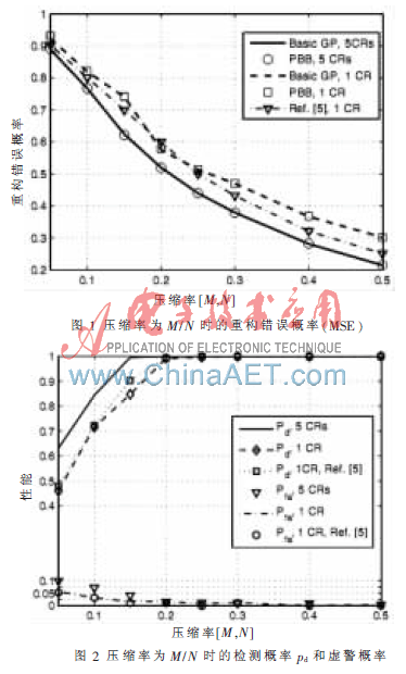 图1表明:在压缩感知中,当压缩率减小的时候,MSE增加。如果考虑多用户的频谱感知机制,MSE也会随着用户的减少而增加。因此,可以采用降低压缩率,而增加感知用户的方法来进行压缩感知,不会降低重构的性能。同时, PBB算法比基本GP算法效果更好一点。