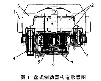 目前使用的基本上都是浮钳式盘式制动器(见图1)。一般由卡钳总成、钳体支架1、摩擦衬片总成2等几个主要部分组成。卡钳总成包括钳体3、导向机构4、传动机构5、自调机构6、气室座7等部分,双推盘结构的制动器还有同步机构。