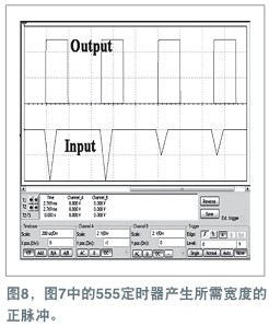 图7中的电路可以将负极性脉冲转换为正脉冲,而输出并不依赖于输入脉冲的幅度。这一版使用的是单电源和一只555定时器(参考文献2)。它产生所需要宽度的正输出脉冲。电阻R1与R3建立了一个饱和阈值。可以用VT−=V+/3×(1−2R3/R1)计算此阈值,其中V+为555定时器的电源电压。电阻R2与电容C1设定脉冲宽度。方程 t=1.1R2C2计算输出高态的持续时间。为了让电路正常工作,饱和脉冲必须短于所需要的脉冲宽度,而脉冲周期则必须大于t。电阻R3必须至少为1.5kΩ。电阻R4可选。