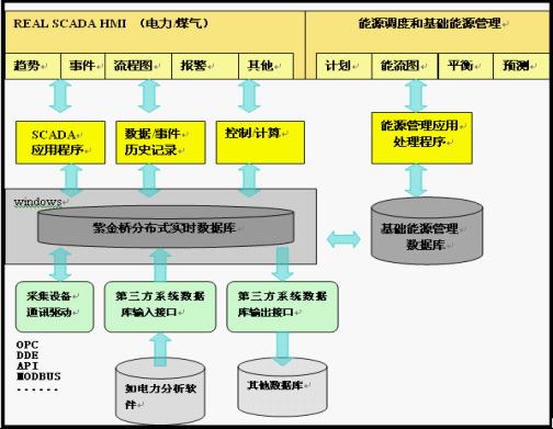 能源数据采集(周期采集、变化采集、SOE)、能源运行监控 (能源实绩、能源计划、能源预测及对比分析)、 分类数据归档(实时数据 短时数据 统计数据 历史数据、记录)、实时闭环调节、逻辑分析处理(条件联锁、越限报警等)、人机界面(过程图、过程曲线、设定和查询等)、管理报表(瞬时报、正点报、日报、周报、月报、年报等)
