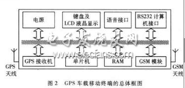 GPS车载移动终端主要由GPS模块及天线、GSM通信模块、微处理器、LCD液晶显示模块、键盘等单元组成。