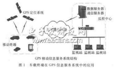 GPS车载移动终端采用世界领先的GPS全球卫星定位技术、无线通信技术及计算机数据处理技术,可为用户提供全方位、全时域空间位置信息。GPS车载移动终端在GPS移动信息服务系统中的应用结构如图1所示。